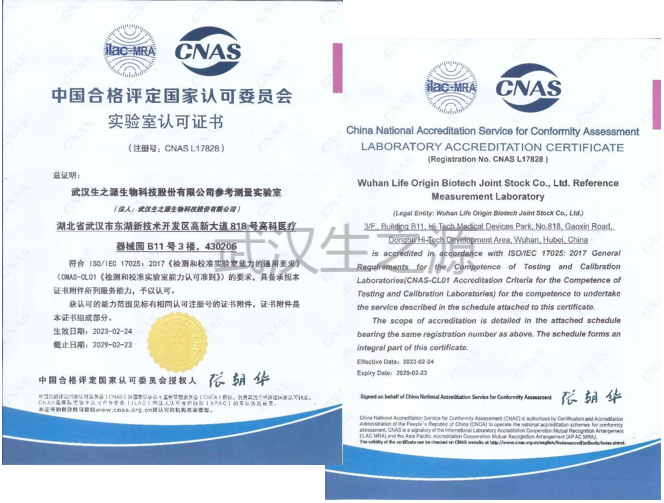 近日,武漢生之源生物參考測量實驗室獲得中國合格評定委員會(CNAS)正式頒發(fā)的認可證書(CNAS-CL01+CNAS-CL07),成為湖北省第一家通過CNAS認可的參考測量實驗室。