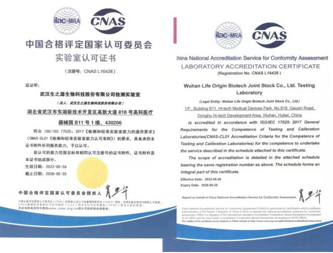 武漢生之源檢測實驗室于2022年5月26日獲得由CNAS官方頒發(fā)的CNAS認可證書(CNAS-CL01)(圖2)。