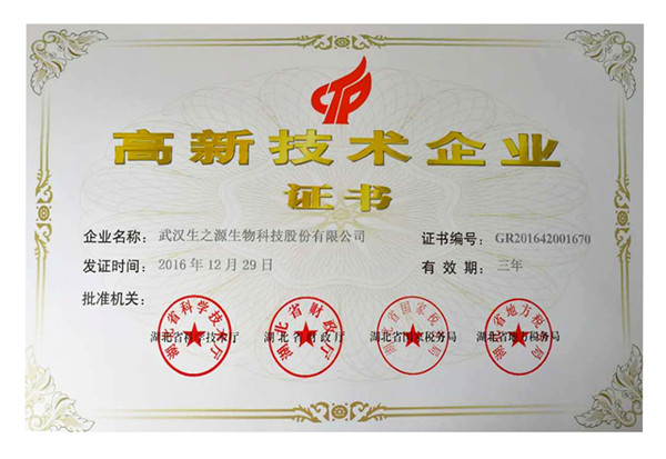 近日,武漢生之源憑借多項授權(quán)發(fā)明專利,以及較好的技術(shù)成果,順利通過高新技術(shù)企業(yè)復(fù)審。在未來3年,公司將繼續(xù)享受國家關(guān)于高新技術(shù)企業(yè)的相關(guān)優(yōu)惠政策,證書編號:GR201642001670。
